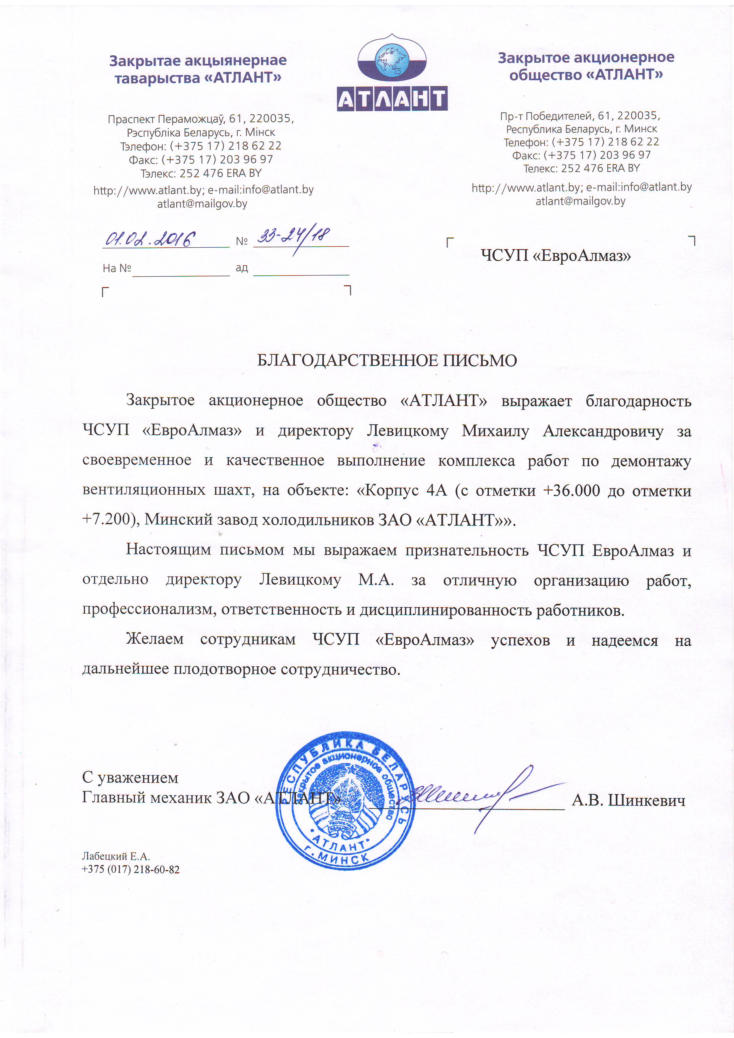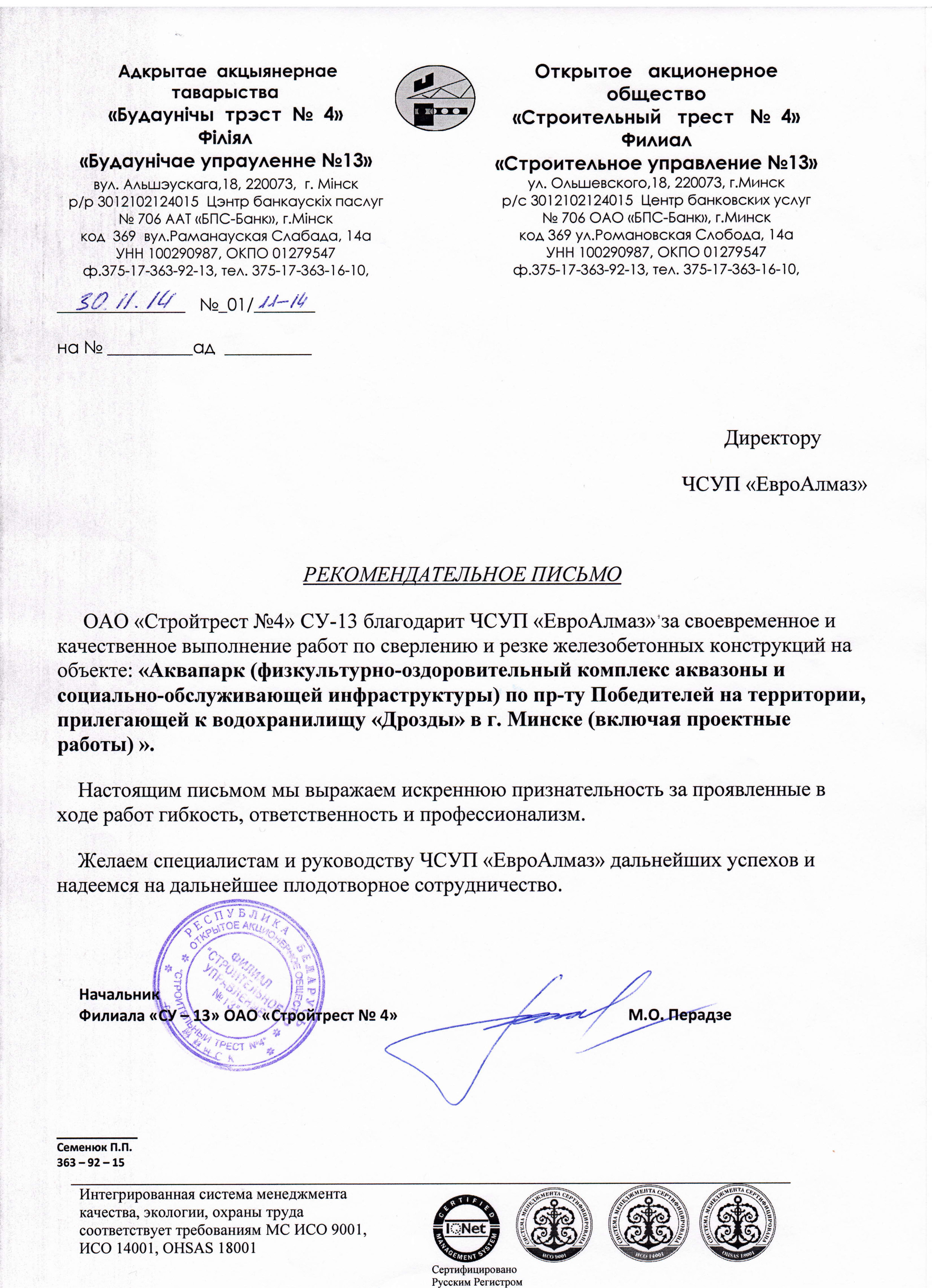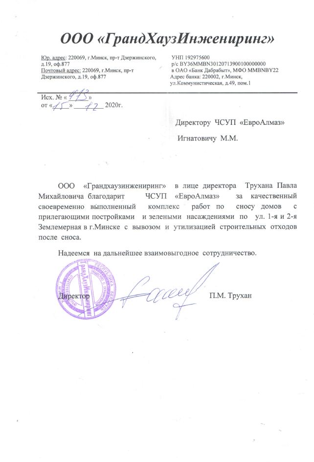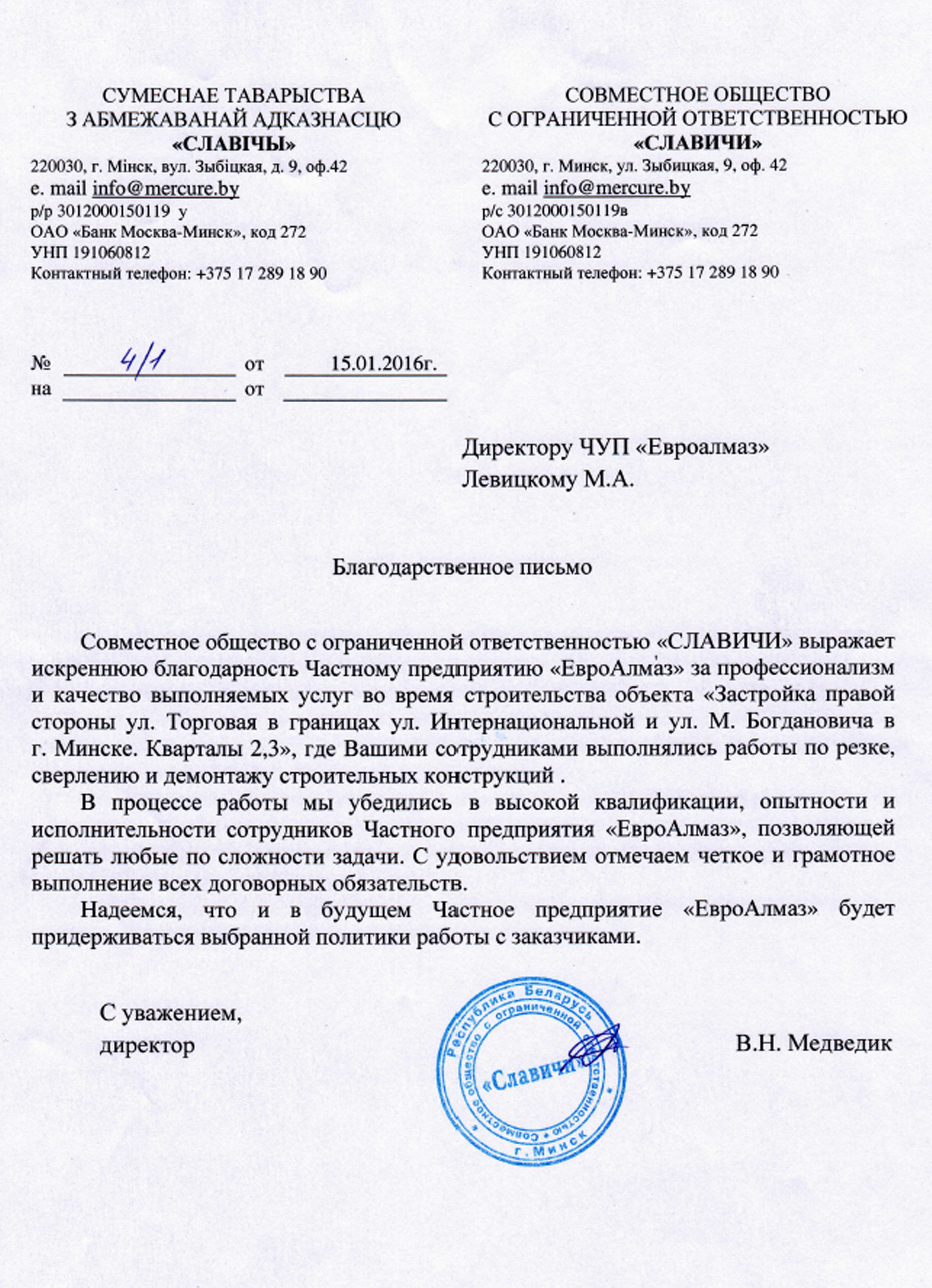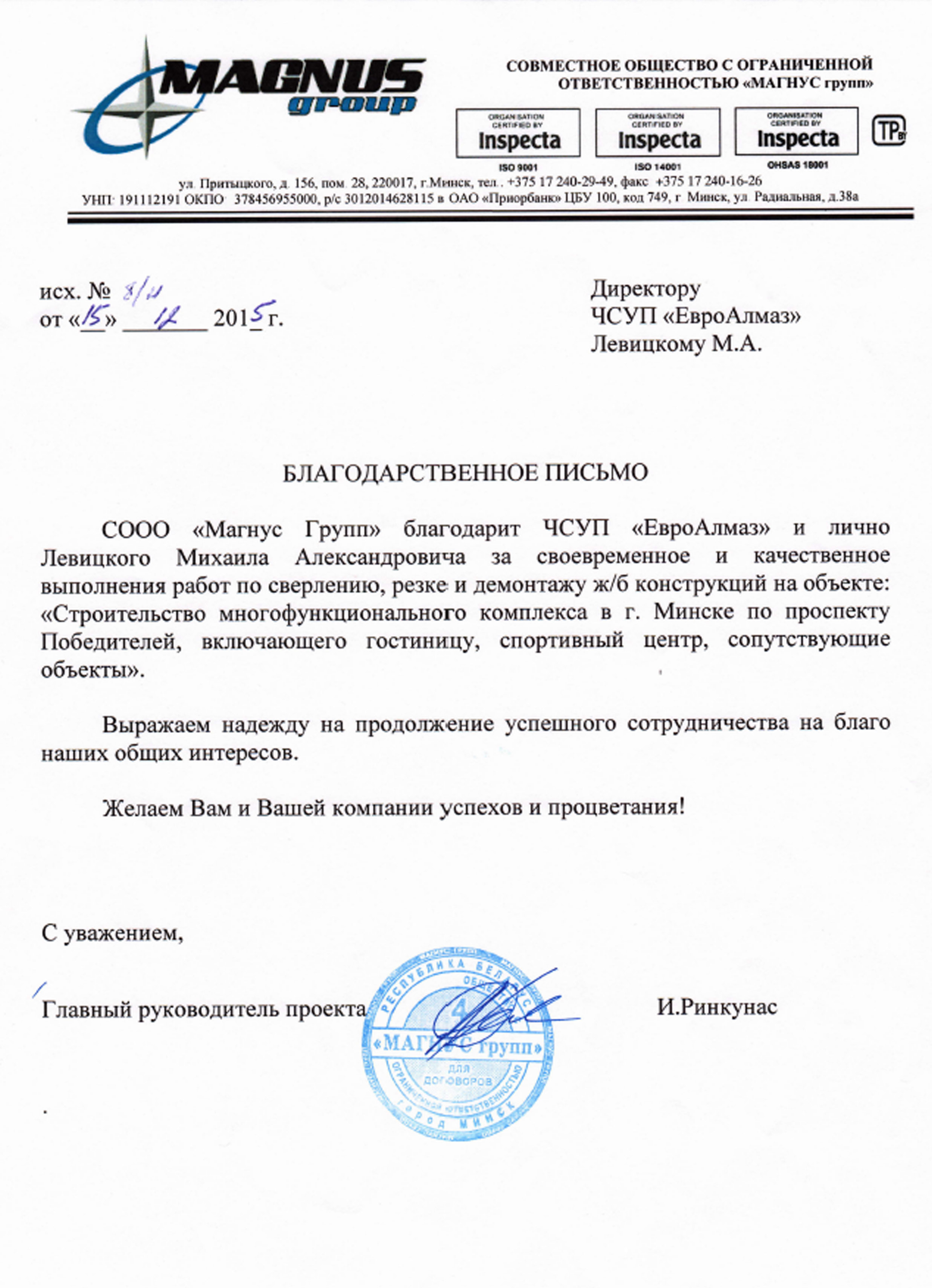 В силу специфики работы нашей организации (проектирование, отделка, ремонт) довольно часто (регулярно) прибегаем к помощи специализированных организаций таких как «ЕвроАлмаз». С данной компанией сотрудничаем уже на протяжении 3-х лет (а это приличный срок для подобных отношений) и на протяжении всего времени, ВСЕГДА, выполнялись поставленные задачи по реконструкции помещений. Особую признательность выражаю Директору компании «ЕвроАлмаз» Михаилу Александровичу за всегда тонкое чувство ситуаций и возможность компромиссных решений.